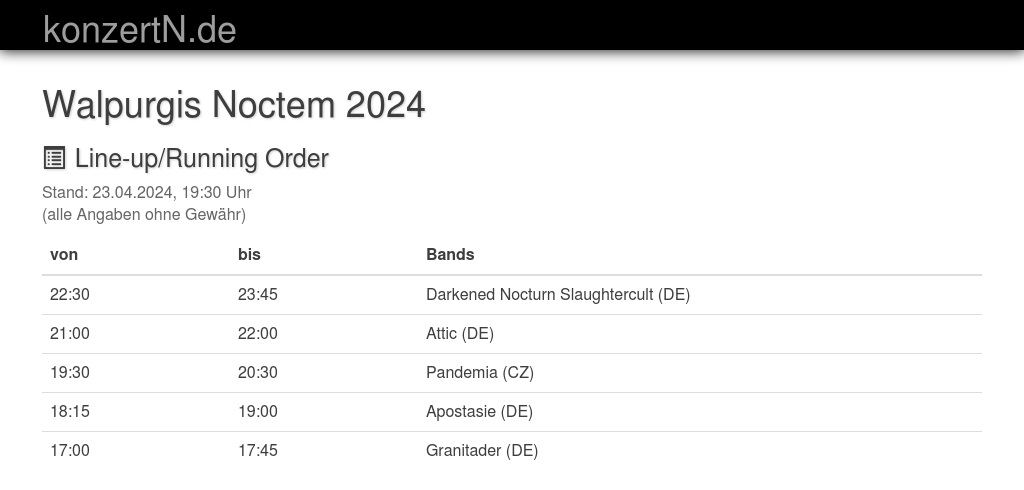 | 22:30 | 23:45 | Darkened Nocturn Slaughtercult (DE) | |