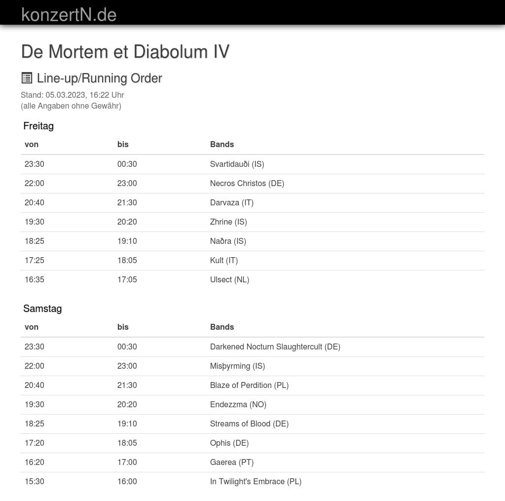 | 23:30 | 00:30 | Darkened Nocturn Slaughtercult (DE) | |